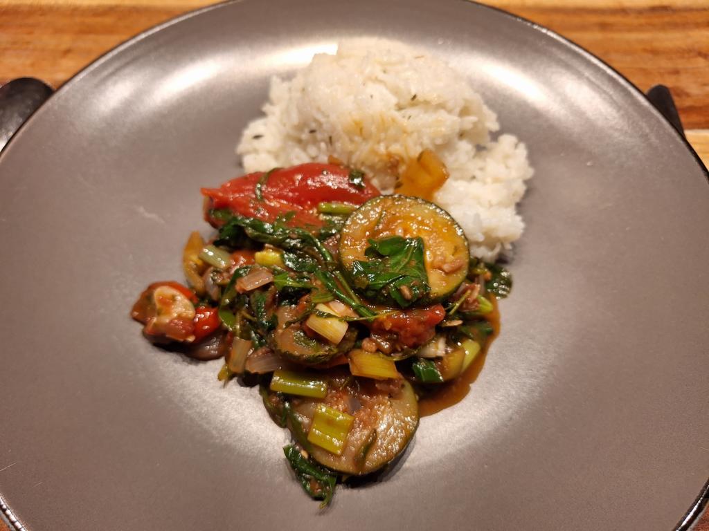 - Das Gemüse ggfs. nochmal mit Salz abschmecken, mit Reis portionsweise auf Teller geben und servieren.