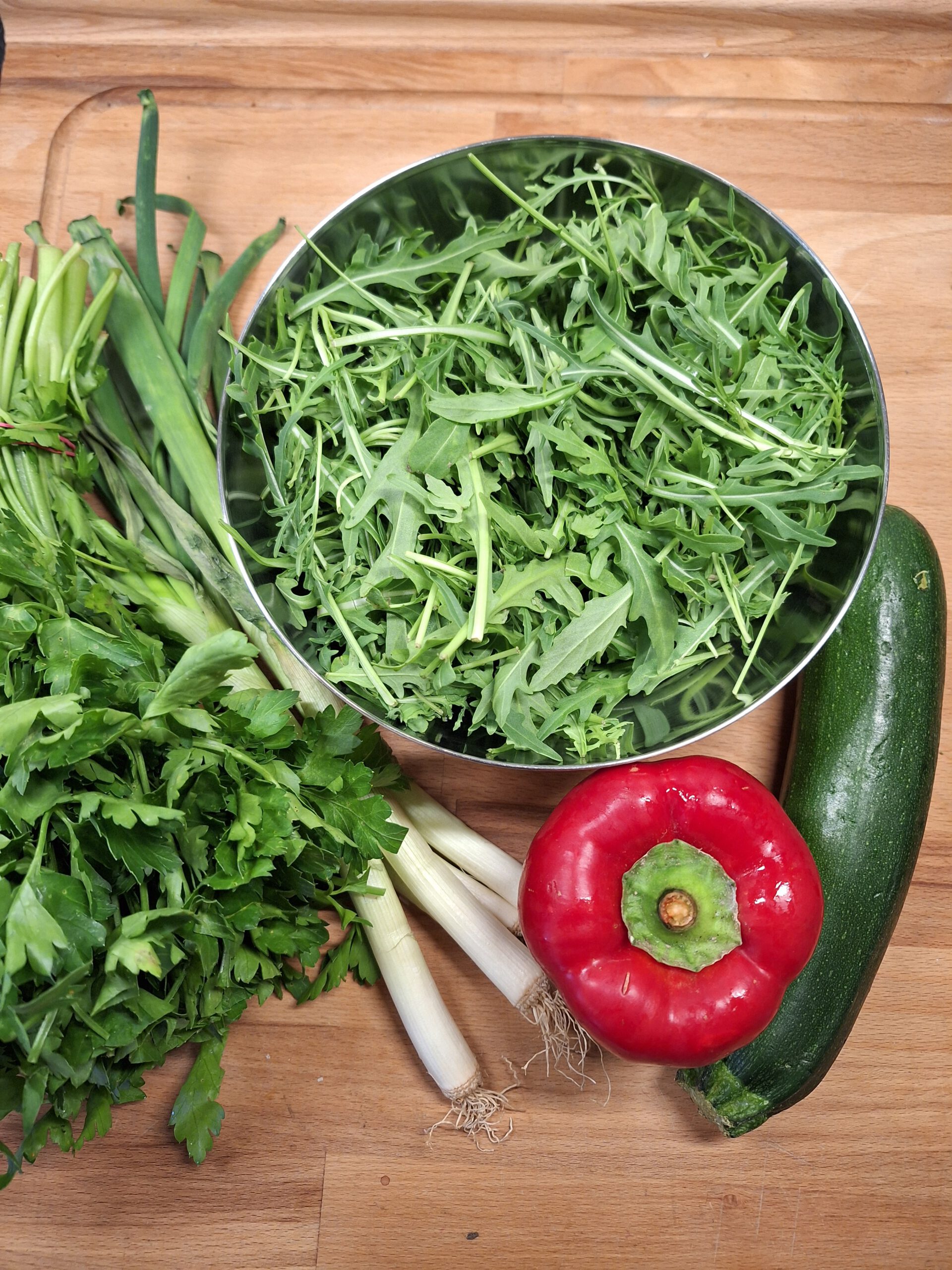 - 120 g Rucola (es gibt hier klein- und großblättrigen. Wir haben die kleinblättrige Variante verwendet, da diese nicht von harten Stielen befreit werden muss)