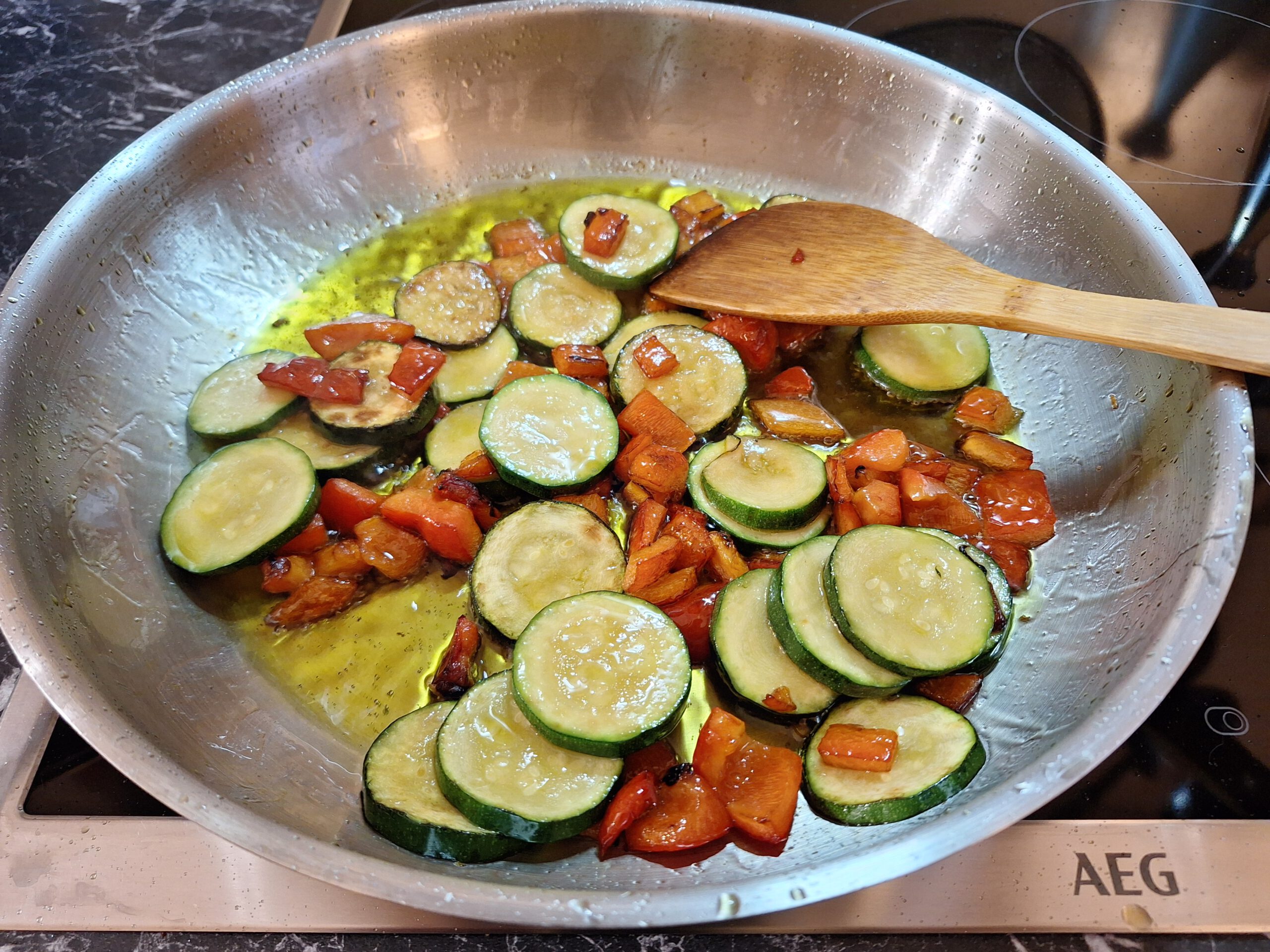 - Die Zucchini hinzugeben und ebenfalls anrösten.