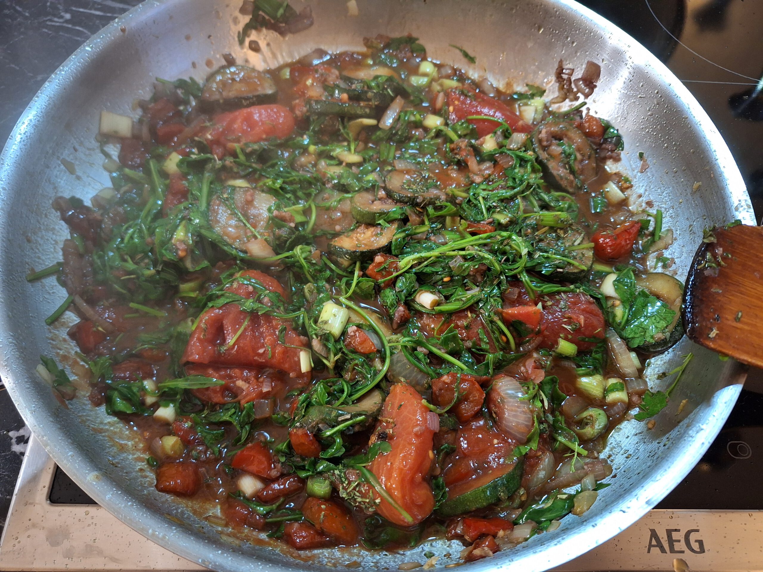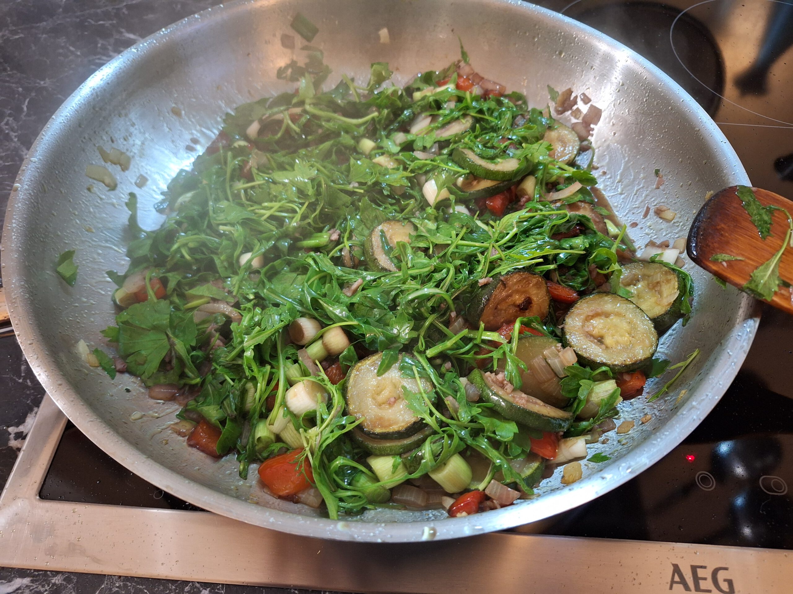 Das Wetter ist heute „typisch frühlingshaft“ grau und leicht verregnet – wir kochen dagegen an: Gemüsepfanne auf Grundlage von Rucola, Zucchini, Paprika und Frühlingszwiebeln. Von der Herstellung nicht aufwändig, bedeutet nur etwas „Schnippel-Arbeit“ und belohnt mit einem Geschmackserlebnis. Auch der Reis als Beilage verdient Beachtung, da man mit Gewürzen viel erreichen kann.