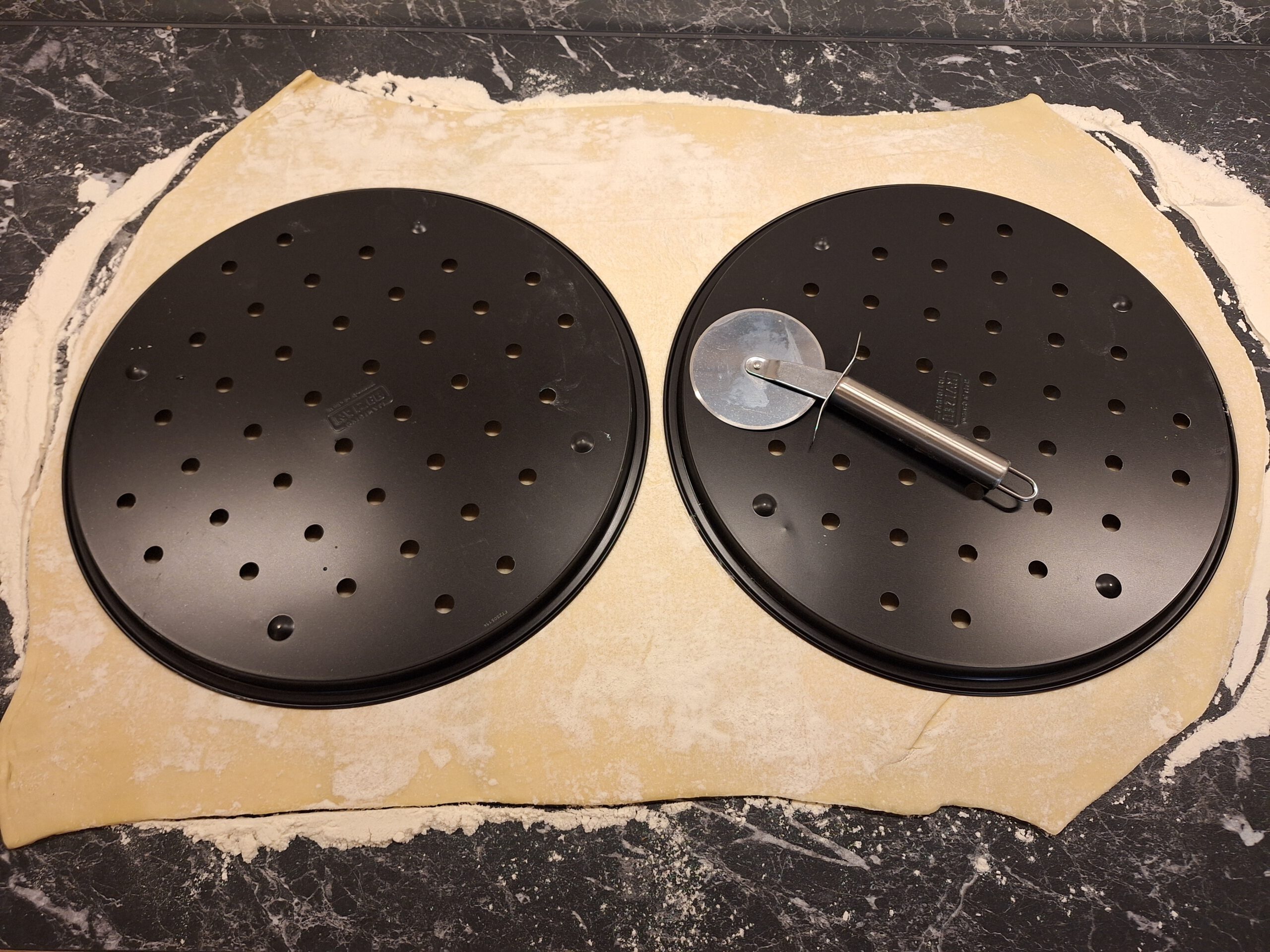 - Den Teig ausrollen und die Pizzableche umgekehrt darauf legen, um eine „Schablone“ für den Teig zu erhalten.
