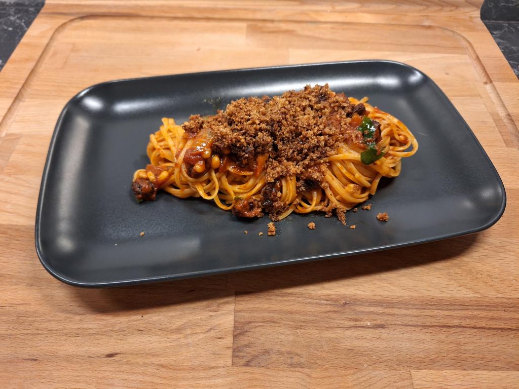 - Auf einem Teller anrichten und die weitere Sauce und die Semmelbrösel darüber geben.