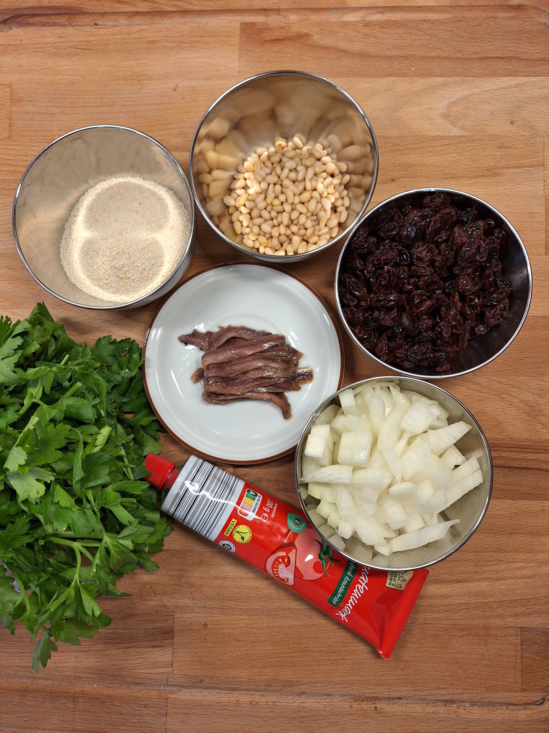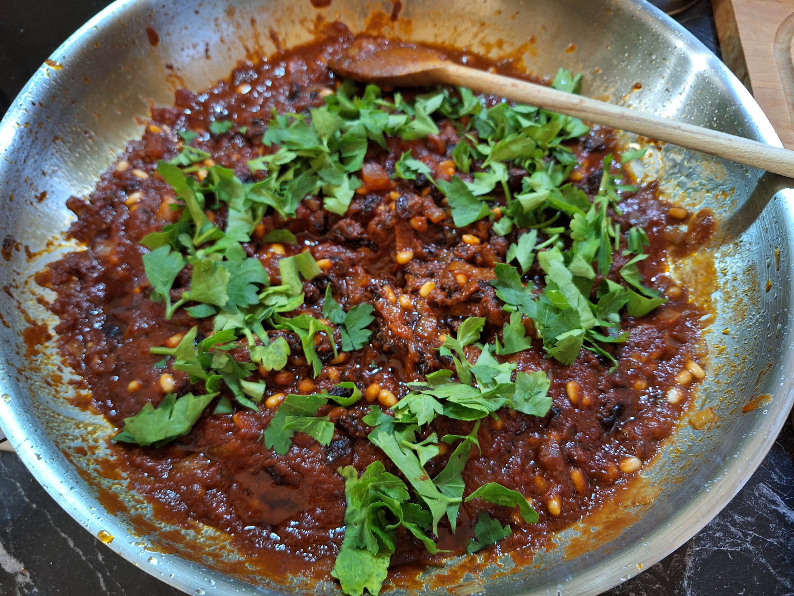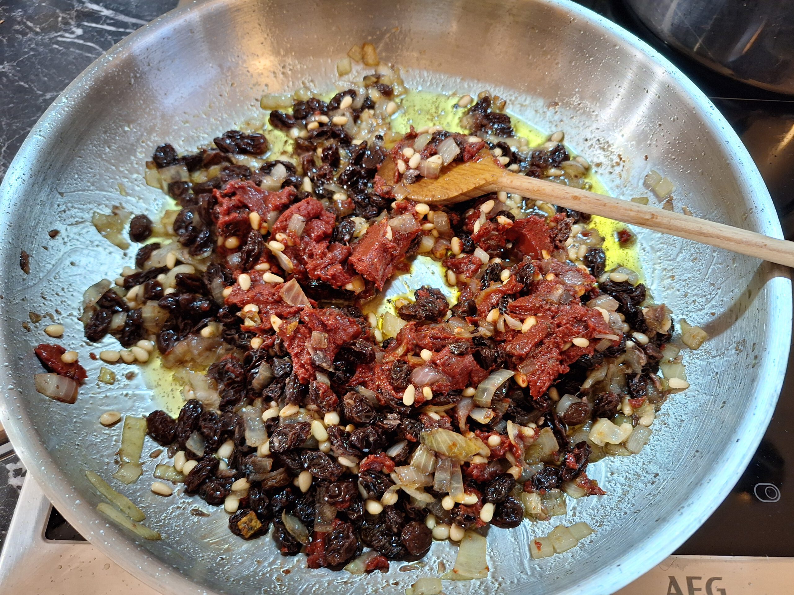 - Pinienkerne und Tomatenmark mit den Rosinen hinzugeben.
