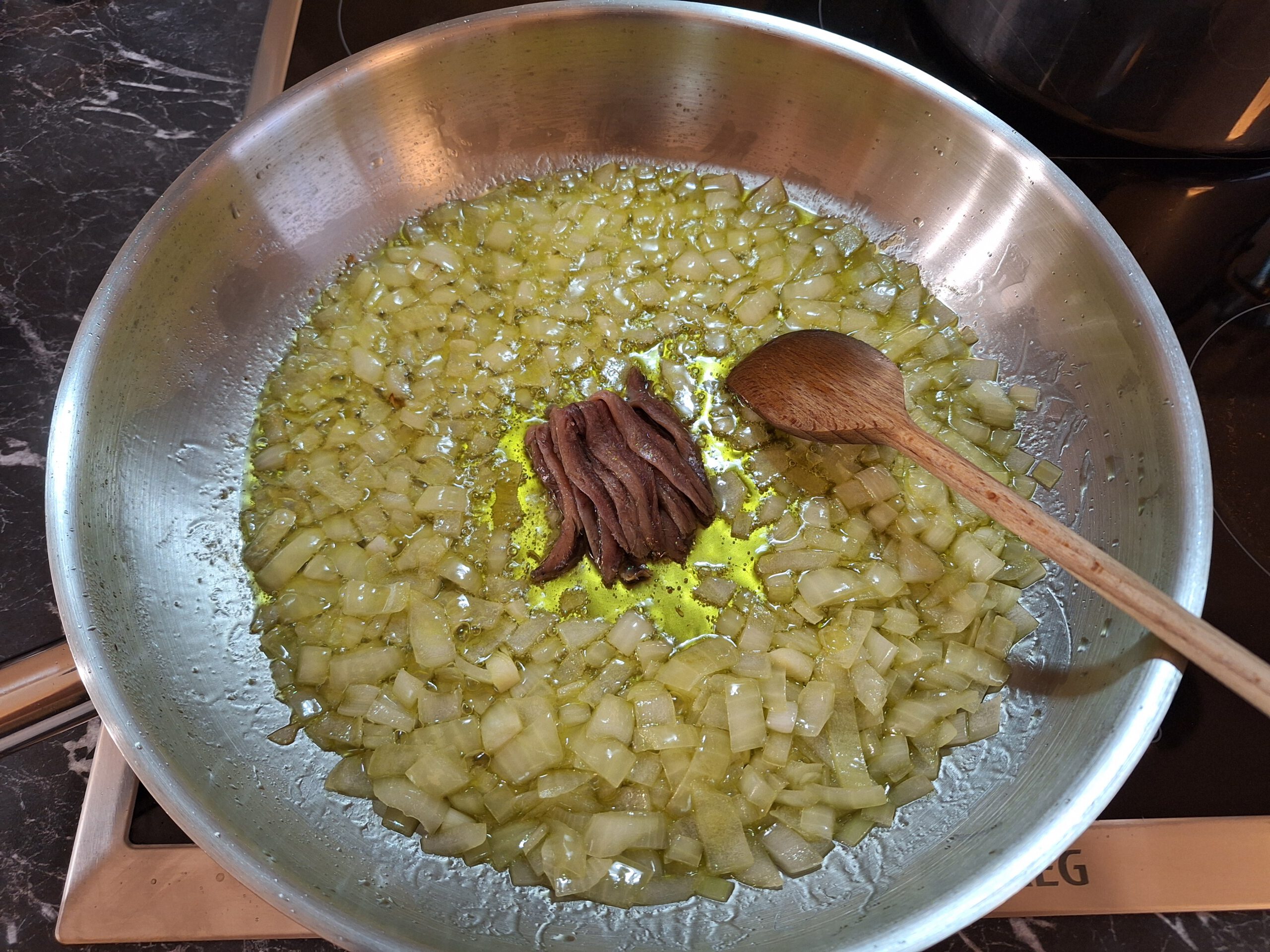 - Sardellen anbraten und dabei in kleine Stücke zerteilen, bis sie sich dabei „auflösen“ und in der Pfanne nur noch als kleine Stücke erkennbar sind.