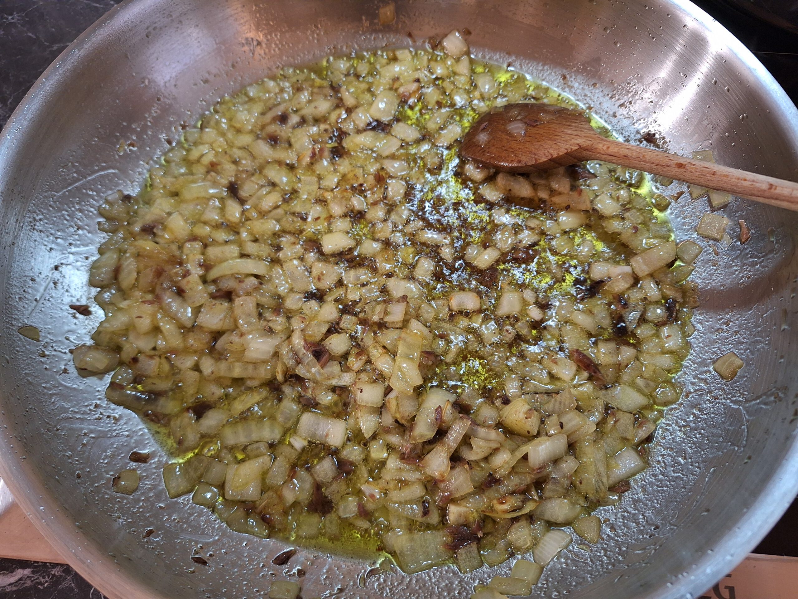- In einer Pfanne Zwiebeln in reichlich Öl anschwitzen.