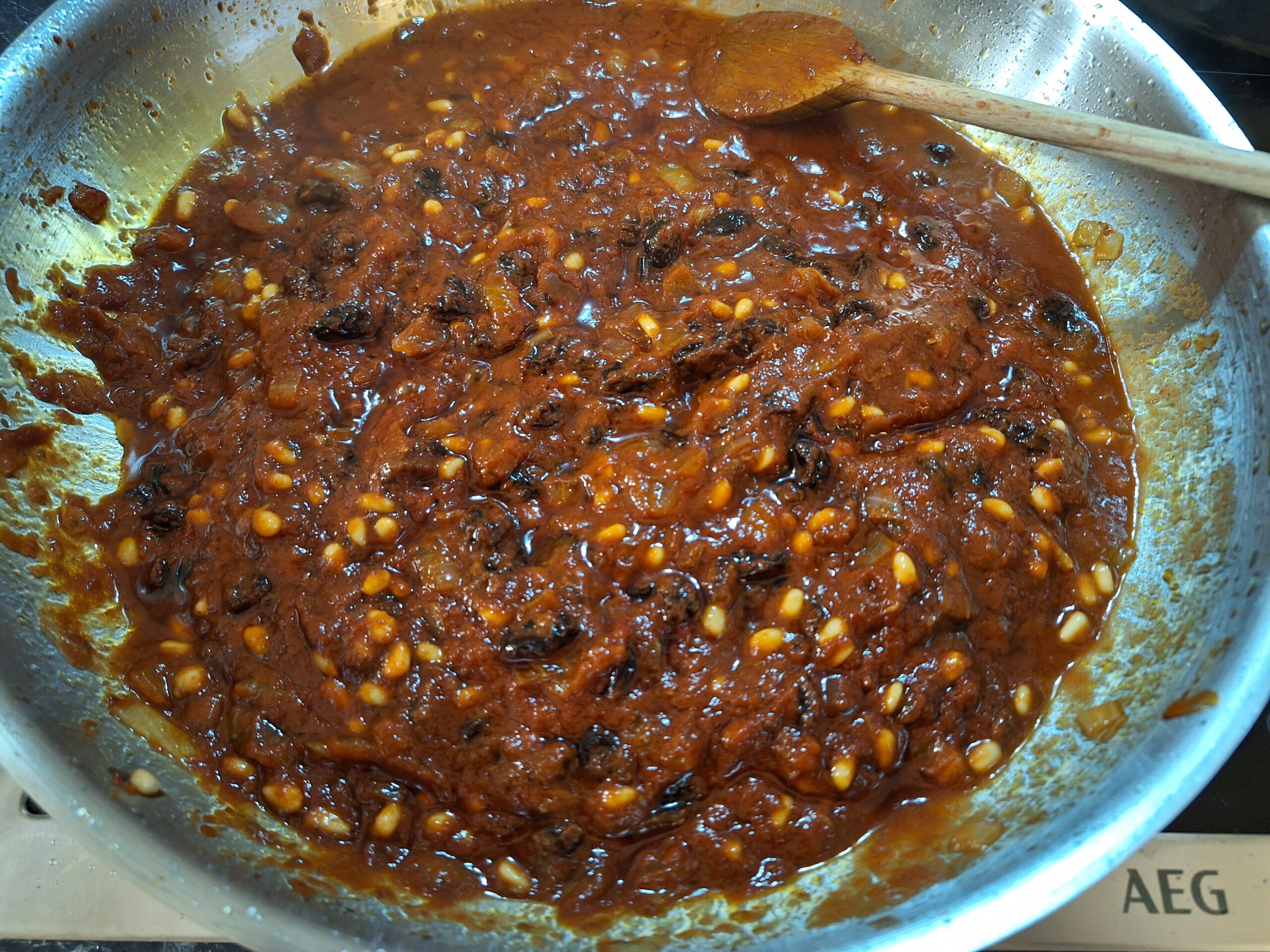 Pinienkerne, Rosinen und Tomatenmark hinzufügen.
