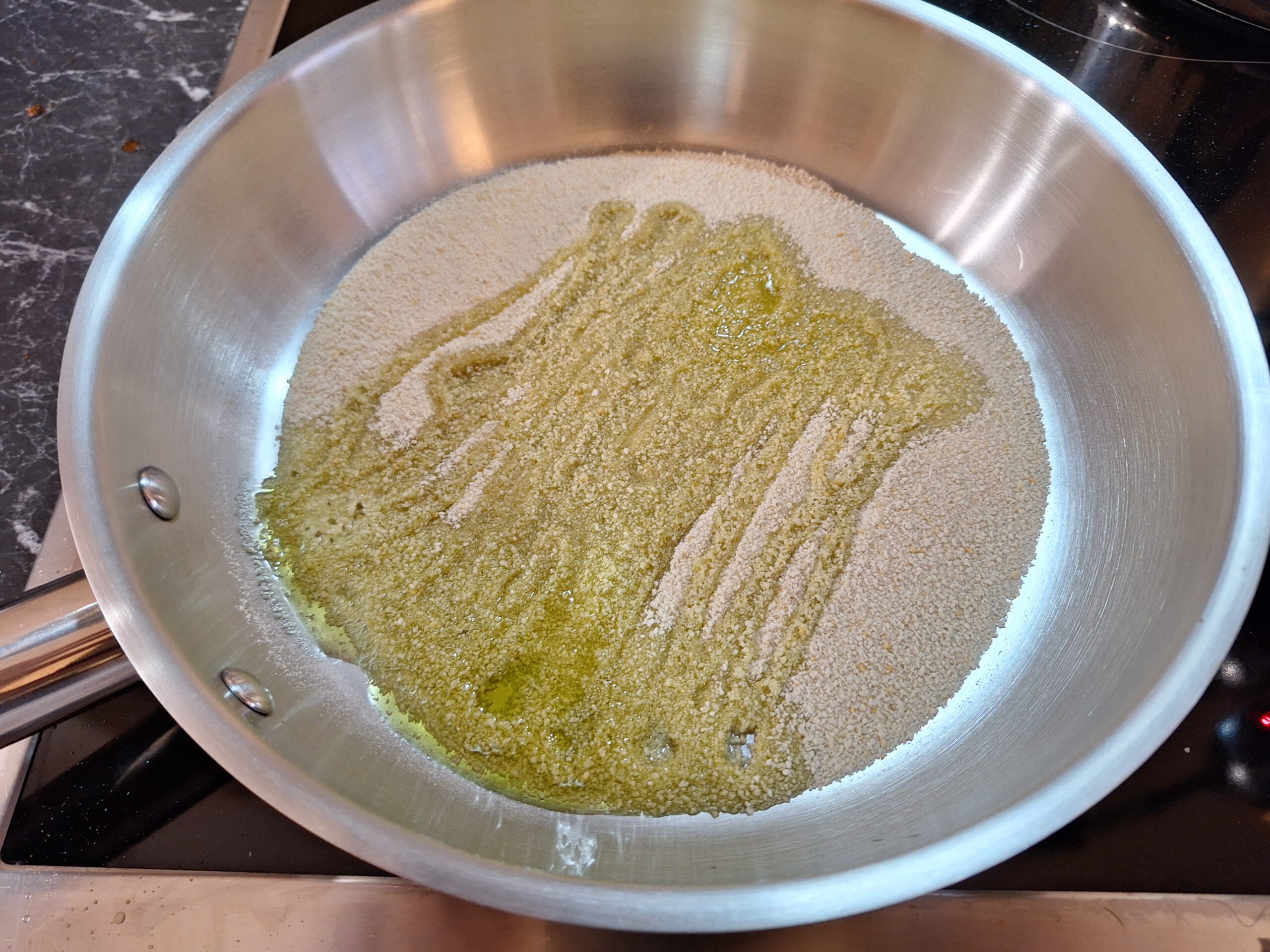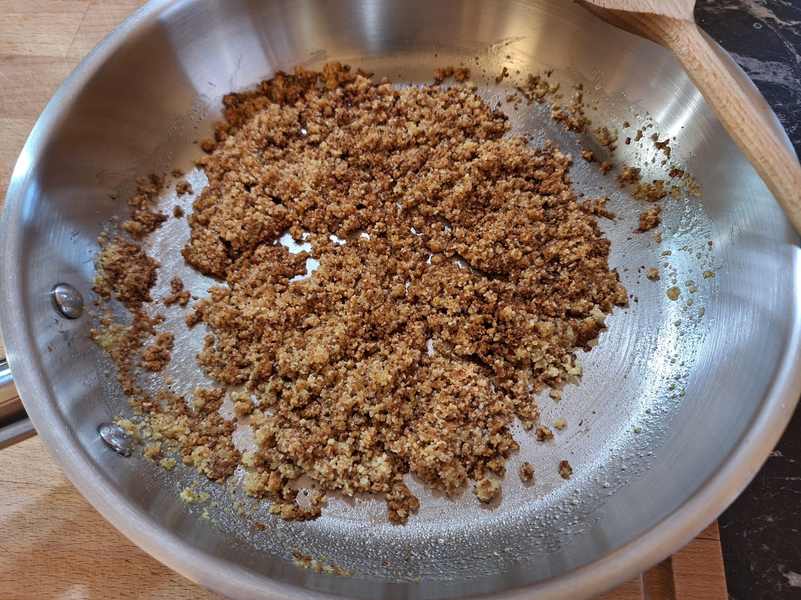 - In einer weiteren Pfanne Paniermehl mit etwas Öl anrösten, bis dieses knapp dunkel wird. Beiseite stellen.