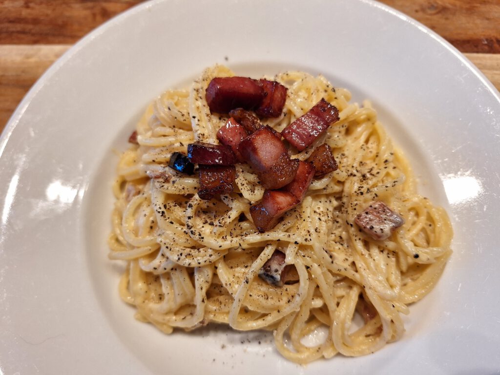 Spaghetti Carbonara – neben Bolognese ein Synonym für Nudelgerichte und spätestens sein Spliffs Album „85555“ ein Begriff. Der Ursprung wird etwa auf das Jahr 1944 datiert, entstanden in Rom – allerdings existieren seitdem gefühlt genau so viele verschiedene Varianten wie es in Italien gestandene Mamas gibt. Am ehesten nähert man sich dem, wenn man mal mehrere italienische Rezepte queliest. Wir haben uns dabei auf mehrere italienische Rezepte bezogen, die sich auf wenige Zutaten beschränken: Pasta, Ei-Dotter, Schinken, Pecorino und wenige Gewürze. Geschmacklich: Hervorragend. Das Rezept, das wir hier vorstellen, beruht auf genau dem „Weniger ist mehr“. Es beschränkt sich wirklich auf wenige Zutaten, und eine Carbonara mit Milch, Sahne oder aus der Tüte kommt eben nicht in die Tüte!