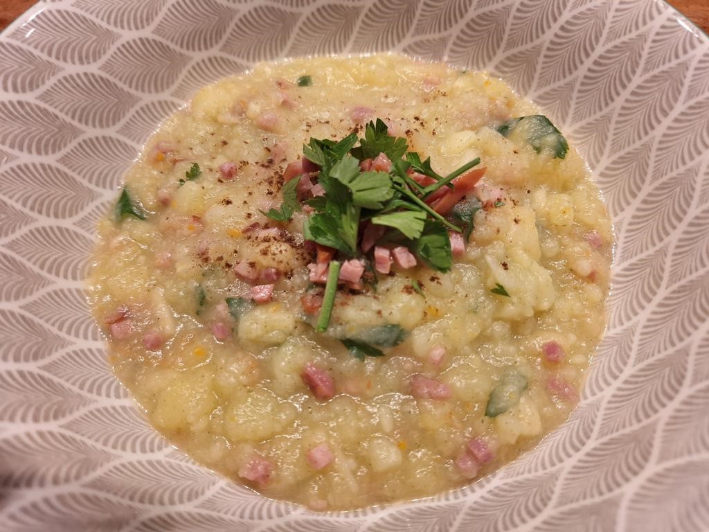 - Portionsweise in den Teller geben, mit einer Prise Piment, etwas Petersilie und Speckwürfeln garnieren und servieren.