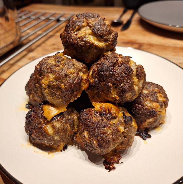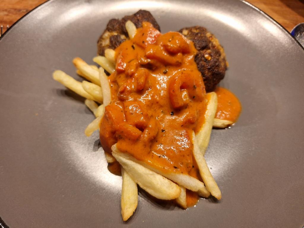 Als Gericht wurden Bifteki (siehe unser Rezept) und Pommes Frites serviert.